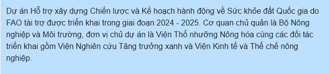 Sáng 29/9, Viện Thổ nhưỡng Nông hóa (Viện Khoa học Nông nghiệp Việt Nam) tổ chức hội thảo tổng kết dự án “Hỗ trợ xây dựng chiến lược và kế hoạch hành động về sức khỏe đất quốc gia”, đồng thời công bố dự thảo Chiến lược Sức khỏe đất Quốc gia đến năm 2030, tầm nhìn 2050 và Kế hoạch hành động Quản lý Sức khỏe đất. Các tài liệu nghiên cứu từ dự án được đánh giá là kết quả quan trọng, đặt nền móng cho một chiến lược tổng thể ở cấp quốc gia.