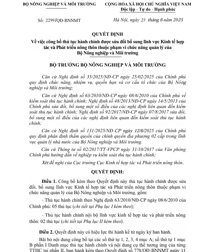 Công bố thủ tục hành chính được sửa đổi bổ sung lĩnh vực Kinh tế hợp tác và Phát triển nông thôn thuộc phạm vi chức năng quản lý của Bộ Nông nghiệp và Môi trường