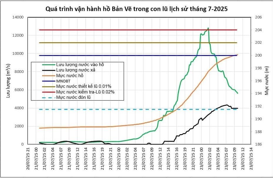 Hồ Thác Bà, được thiết kế với khả năng chống chịu lũ tần suất 1/10.000 năm, chưa tròn 65 năm tuổi đã buộc phải xả lũ trong điều kiện lưu lượng vượt gấp 1,74 lần mức tính toán này. Hồ thủy điện Bản Vẽ – "lá chắn" điều tiết lớn nhất miền Trung, với tần suất lũ kiểm tra 0,02% (tương ứng lũ 5.000 năm lặp lại) mới 20 năm vận hành cũng đã gặp thử thách vượt ngưỡng lũ kiểm tra (đỉnh lũ đạt 12.800 m3/s lúc 2h sáng ngày 23/7, trong khi lũ 0,02% là 10.500 m3/s). Những con số lạnh lùng này đặt ra một câu hỏi nhức nhối: hệ thống tiêu chuẩn, dự báo và quản lý vận hành hồ chứa hiện nay liệu có còn đủ sức chống đỡ trước thực tại?