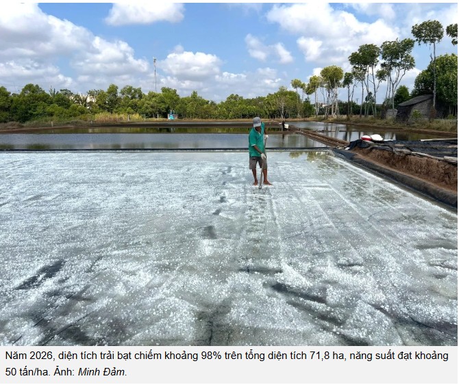 Đáng chú ý, diện tích sản xuất theo phương pháp trải bạt tăng nhanh, mang lại hiệu quả kinh tế cao hơn so với phương thức truyền thống, rút ngắn thời gian kết tinh và giảm công lao động. Năm 2026, diện tích trải bạt chiếm khoảng 98% trên tổng diện tích 71,8 ha, năng suất đạt khoảng 50 tấn/ha.