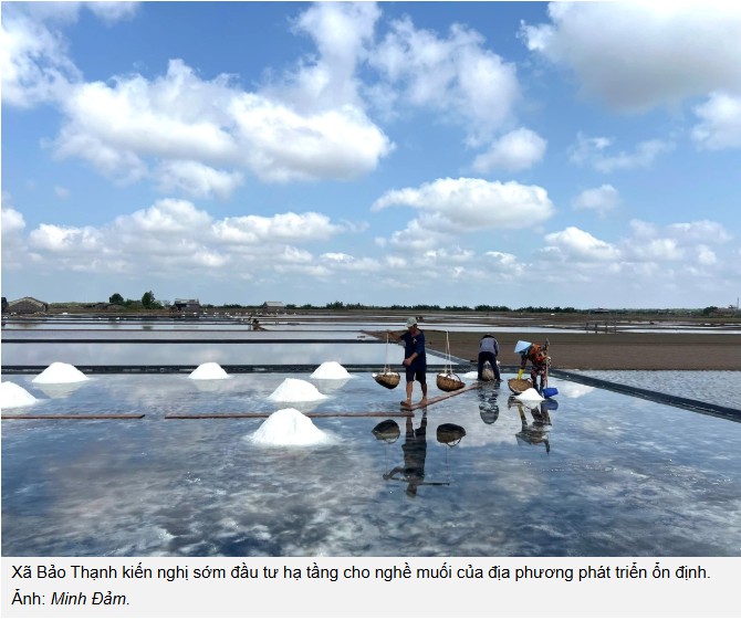 Ông Võ Quốc Đạt, Phó Chủ tịch UBND xã Bảo Thạnh, cho biết: “Sản xuất muối là ngành nghề truyền thống của địa phương, tập trung trong khoảng 6 tháng mùa nắng. Thời gian qua, địa phương đã được hỗ trợ nhiều giải pháp, từ ứng dụng công nghệ đến nâng cao chất lượng sản phẩm. Tuy nhiên, các hạng mục hạ tầng thiết yếu như giao thông, thủy lợi vẫn triển khai chậm, chưa đáp ứng nhu cầu sản xuất và tiêu thụ.