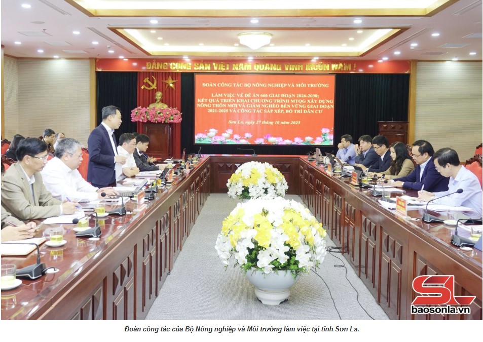 Ngày 27/10, Đoàn công tác của Bộ Nông nghiệp và Môi trường do đồng chí Võ Văn Hưng, Thứ trưởng Bộ Nông nghiệp và Môi trường làm Trưởng đoàn đã có cuộc làm việc với UBND tỉnh Sơn La về kết quả triển khai thực hiện Đề án “Ổn định dân cư, phát triển kinh tế - xã hội vùng tái định cư thủy điện Sơn La” (Đề án 666), kết quả các Chương trình mục tiêu quốc gia giai đoạn 2021-2025 và định hướng giai đoạn 2026-2030; công tác sắp xếp, ổn định dân cư vùng thiên tai cấp bách.