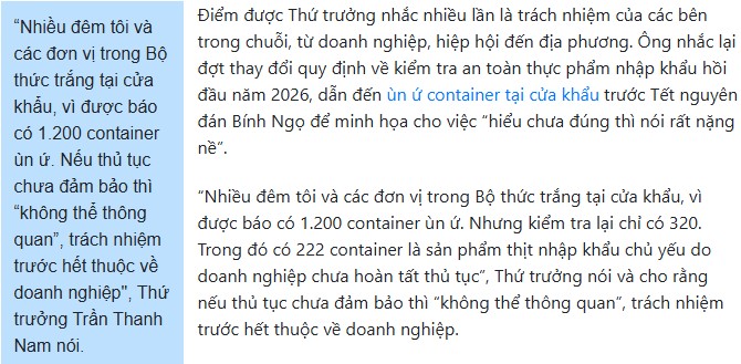 Bước sang năm 2026, bên cạnh phân cấp quản lý an toàn thực phẩm, Thứ trưởng Trần Thanh Nam đặc biệt lưu ý tới vấn đề thiếu nguyên liệu, coi đây là “mâu thuẫn lâu năm”. Dù Việt Nam có lợi thế nông nghiệp, doanh nghiệp vẫn thiếu nguyên liệu đầu vào cho chế biến, xuất khẩu. Ông cho rằng cốt lõi nằm ở liên kết sản xuất yếu, hợp đồng giữa doanh nghiệp và vùng nguyên liệu chưa đúng bản chất.