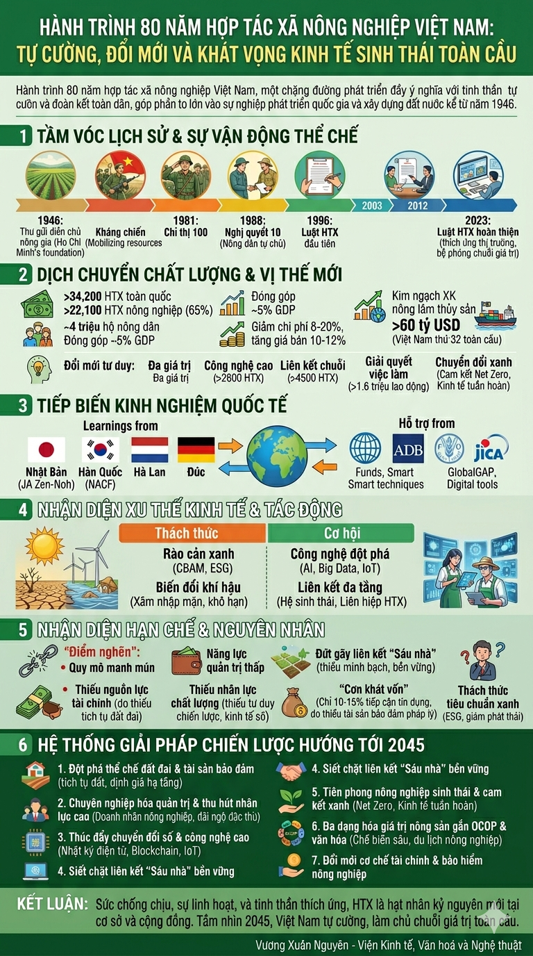 Nhìn lại hành trình 80 năm, kinh tế tập thể nông nghiệp đã chứng minh sức sống mãnh liệt và khả năng thích ứng linh hoạt trước mọi biến động của lịch sử. Từ những nhận định về xu hướng phát triển xanh và sự tiếp biến tinh hoa kinh nghiệm quốc tế, HTX nông nghiệp khẳng định vị thế là hạt nhân không thể thay thế trong cấu trúc nông thôn Việt Nam. Với hệ thống bảy giải pháp đột phá đã được định hình, bám sát tư duy chiến lược của Đại hội XIV, chúng ta tin tưởng rằng HTX nông nghiệp sẽ thực hiện thành công sứ mệnh chuyển đổi sang nền nông nghiệp sinh thái, trách nhiệm và bền vững. Tầm nhìn 2045 không chỉ là mục tiêu về doanh thu hay số lượng, mà là khát vọng về một Việt Nam tự cường, làm chủ chuỗi giá trị toàn cầu, nơi kinh tế tập thể là trụ cột vững chắc cho sự hưng thịnh của dân tộc. Toàn bộ tiến trình này đòi hỏi sự minh bạch trong quản trị, trách nhiệm trong thực thi và sự đồng hành khăng khít của "sáu nhà" để kiến tạo nên những giá trị mới cho nông nghiệp nước nhà.