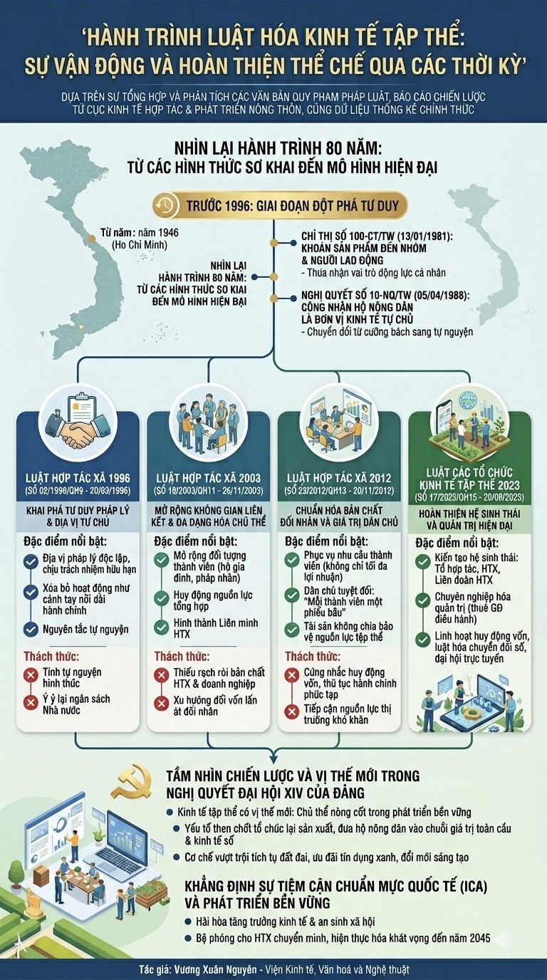 Nhìn lại hành trình 80 năm từ những ngày đầu hình thành qua các mốc Luật 1996, 2003, 2012 và 2023, chúng ta thấy một sự nhất quán trong mục tiêu đưa kinh tế tập thể về đúng bản chất tự nguyện và dân chủ. Hệ thống pháp luật hiện nay đã thực sự hoàn thiện, trở thành bệ phóng để hợp tác xã chuyển mình mạnh mẽ. Trong bối cảnh hiện nay, khi các rào cản thể chế đã được gỡ bỏ và tầm nhìn 2045 đã được xác lập rõ ràng tại Đại hội XIV, kinh tế tập thể Việt Nam chắc chắn sẽ phát huy tối đa tiềm năng, đóng góp quan trọng vào sự phồn vinh của đất nước và nâng tầm vị thế của người lao động trong chuỗi giá trị toàn cầu. Việc kiên trì con đường luật hóa minh bạch chính là chìa khóa để xây dựng một nền kinh tế độc lập, tự chủ và giàu tính nhân văn, bảo đảm sự hài hòa giữa lợi ích kinh tế và tiến bộ xã hội.