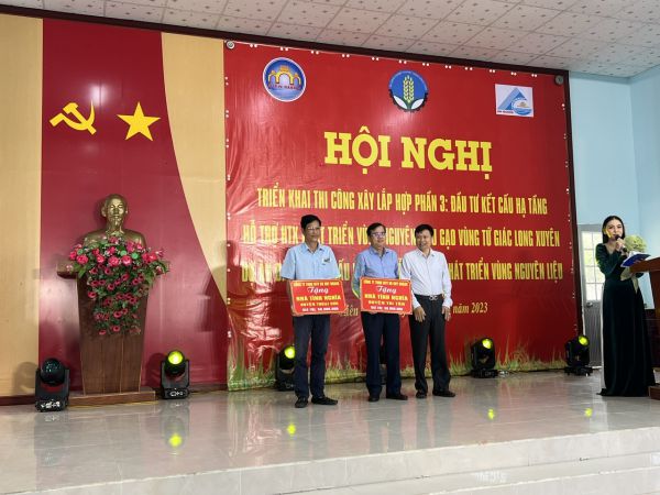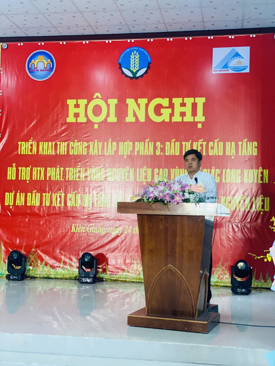 Sau thời gian triển khai thực hiện các thủ tục theo quy định, Hợp đồng thi công số 03/2023/HĐXL-HTX (GT14A) thuộc dự án Đầu tư kết cấu hạ tầng hỗ trợ Hợp tác xã phát triển vùng nguyên liệu đã được ký kết ngày 12/7/2023, Thi công các hạng mục công trình và thiết bị Hợp phần 3 tại tỉnh An Giang và Kiên Giang và công tác bàn giao mặt bằng thi công đến nay đã được địa phương hoàn tất cho đơn vị thi công xây lắp. Để tạo không khí đẩy nhanh tiến độ triển khai thi công Hợp phần 3 góp phần phục vụ Đề án phát triển vùng nguyên liệu gạo vùng Tứ Giác Long Xuyên; sáng nay ngày 24 tháng 07 năm 2023 tại Hội trường UBND xã Kiên Bình, huyện Kiên Lương, tỉnh Kiên Giang, Bộ Nông nghiệp và PTNT đã tổ chức Hội nghị triển khai thi công xây lắp Hợp phần 3: Đầu tư kết cấu hạ tầng hỗ trợ HTX phát triển vùng nguyên liệu gạo vùng Tứ Giác Long Xuyên - dự án Đầu tư kết cấu hạ tầng hỗ trợ HTX phát triển vùng nguyên liệu.