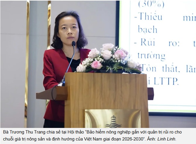Bà Trương Thu Trang dẫn ví dụ Thái Lan, nơi bảo hiểm được gắn trực tiếp với tín dụng nông nghiệp thông qua Ngân hàng Nông nghiệp và Hợp tác xã. Khi nông dân vay vốn, họ đồng thời được hỗ trợ tới 100% phí bảo hiểm lúa gạo.