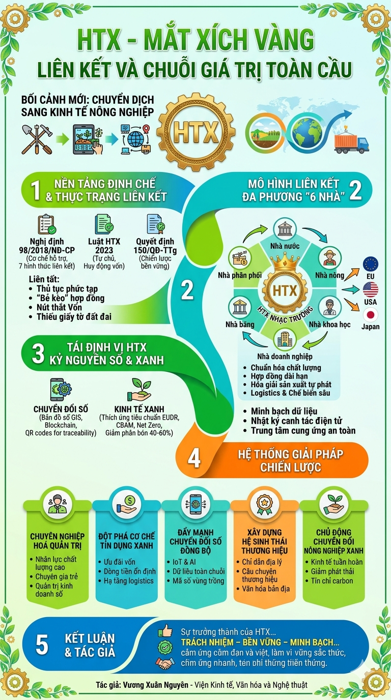 Sự lớn mạnh và chuyên nghiệp hóa của các HTX, dưới sự dẫn dắt của hệ thống pháp lý hoàn thiện như Nghị định 98, Luật HTX 2023 và Quyết định 150 kết hợp với tư duy kinh tế số, chính là chìa khóa để hóa giải những điểm nghẽn của nông nghiệp Việt Nam. Với tinh thần liên kết chuỗi bền vững và khát vọng vươn tầm, các HTX sẽ tiếp tục củng cố vai trò là mắt xích vàng, không chỉ bảo đảm an ninh lương thực quốc gia mà còn đưa vị thế nông sản Việt tiến sâu, vững chắc và khẳng định giá trị bản sắc độc đáo trong dòng chảy giá trị toàn cầu. Trong bối cảnh hiện nay, sự thành bại của nông nghiệp Việt Nam gắn liền với sự trưởng thành của mô hình kinh tế tập thể hiện đại, nơi mà mỗi thành viên HTX đều trở thành một doanh nhân nông nghiệp có trách nhiệm với cộng đồng và thế giới. Việc kiến tạo một hệ sinh thái HTX bền vững không chỉ là mục tiêu kinh tế, mà còn là thông điệp mạnh mẽ về sự đoàn kết và nội lực của dân tộc Việt Nam trên hành trình chinh phục những đỉnh cao mới của nhân loại.