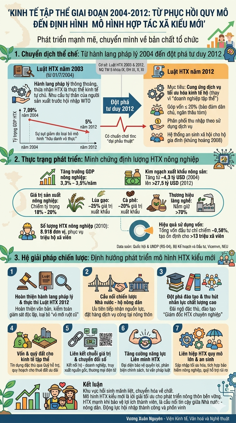 Hành trình nghiên cứu giai đoạn 2004 - 2012 cho thấy khu vực kinh tế tập thể không chỉ hồi sinh mãnh liệt sau suy thoái mà còn đang trải qua quá trình tiến hóa tất yếu về chất. Mô hình HTX kiểu mới theo Luật năm 2012 chính là lời giải tối ưu cho bài toán phát triển nông thôn bền vững và bao trùm trong giai đoạn hiện nay. Lập luận xuyên suốt bài viết khẳng định: HTX chỉ thực sự mạnh khi nó bảo vệ được lợi ích thực chất của thành viên và làm tốt vai trò cầu nối tin cậy giữa Nhà nước với hộ nông dân. Với sự quyết tâm đổi mới tư duy từ các cấp lãnh đạo và nỗ lực tự thân của xã viên, kinh tế tập thể chắc chắn sẽ tiếp tục là động lực quan trọng để Việt Nam hội nhập thành công và phồn vinh. Tương lai của nông nghiệp Việt Nam không thể tách rời sự lớn mạnh của mô hình HTX kiểu mới – nơi giá trị nhân văn và hiệu quả kinh tế cùng đồng hành trên con đường thịnh vượng lâu dài cho mọi gia đình và cộng đồng dân cư. Sự trưởng thành của khu vực này không chỉ là một mục tiêu kinh tế, mà còn là minh chứng cho tinh thần đoàn kết và sức sáng tạo vô tận của người dân Việt Nam trong kỷ nguyên đổi mới và phát triển bền vững.