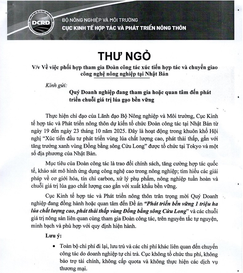 Mời phối hợp tham gia đoàn công tác xúc tiến hợp tác và chuyển giao công nghệ nông nghiệp tại Nhật Bản