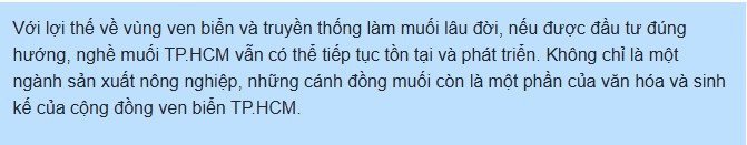 Dù vậy, với nhiều hộ dân ven biển, nghề muối vẫn đem lại nguồn sinh kế quan trọng. Ngoài cung cấp muối cho thị trường tiêu dùng, muối từ các cánh đồng ven biển TP.HCM còn được vận chuyển đến nhiều địa phương khác.