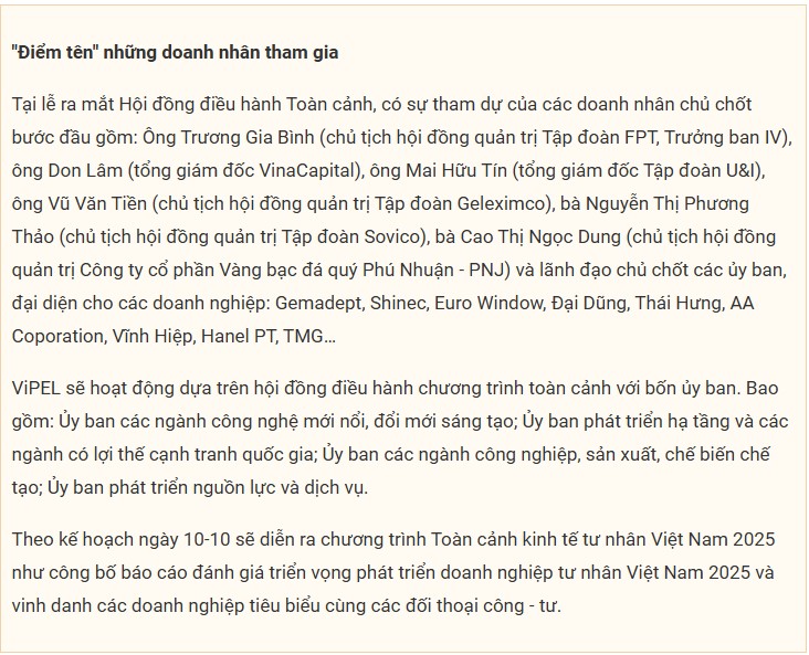 Ngày 11-9, Lễ công bố Mô hình Toàn cảnh kinh tế tư nhân Việt Nam (ViPEL) và ra mắt hội đồng điều hành cùng nhân sự chủ chốt của các ủy ban do Ban Nghiên cứu phát triển kinh tế tư nhân (Ban IV) tổ chức.