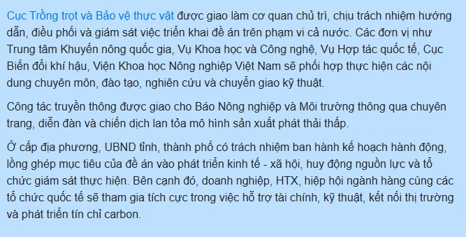 Cuối cùng, hợp tác quốc tế được nhấn mạnh. Bộ Nông nghiệp và Môi trường sẽ tăng cường kết nối với FAO, WB, GIZ, JICA, UNDP, IFAD và nhiều tổ chức khác để tiếp nhận hỗ trợ kỹ thuật, tài chính, cũng như học hỏi kinh nghiệm quản lý. Việt Nam cũng sẽ tham gia các diễn đàn và sáng kiến toàn cầu về nông nghiệp phát thải thấp, mở đường cho nông sản Việt khẳng định vị thế trên thị trường xanh.