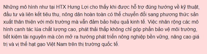 Thành công bước đầu của các mô hình sản xuất lúa chất lượng cao, giảm phát thải là tiền đề thuận lợi để các địa phương trong vùng ĐBSCL tiếp tục nhân rộng, góp phần triển khai hiệu quả Đề án Phát triển bền vững 1 triệu ha chuyên canh lúa chất lượng cao, phát thải thấp gắn với tăng trưởng xanh đến năm 2030 (Đề án 1 triệu ha lúa).