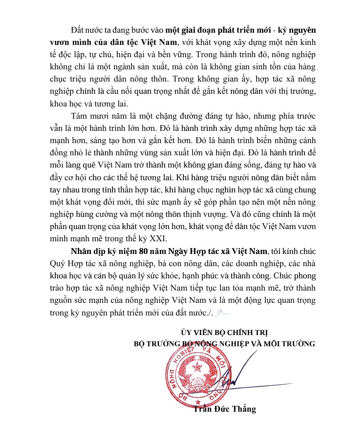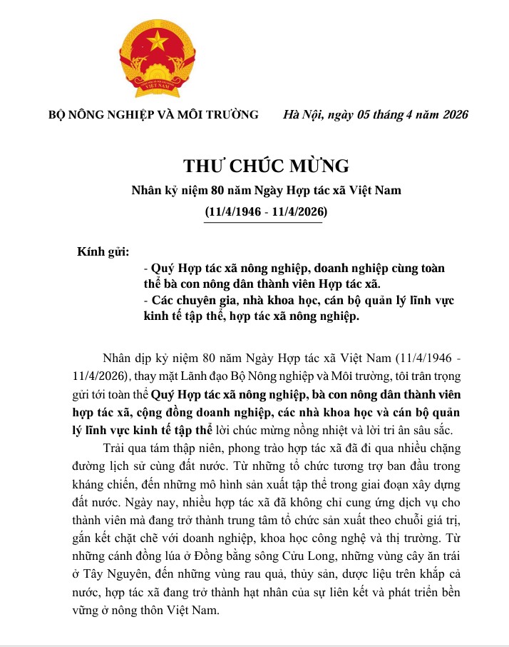 Thư chúc mừng Nhân kỷ niệm 80 năm Ngày Hợp tác xã Việt Nam (11/4/1946 - 11/4/2026)
