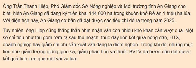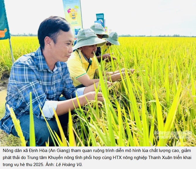 Tại HTX Dịch vụ nông nghiệp Thanh Xuân (ấp Hòa Xuân, xã Định Hòa, tỉnh An Giang), mô hình sản xuất lúa chất lượng cao, phát thải thấp thuộc Đề án 1 triệu ha lúa chất lượng cao đã bước đầu ghi nhận nhiều kết quả khả quan trong vụ hè thu 2025.