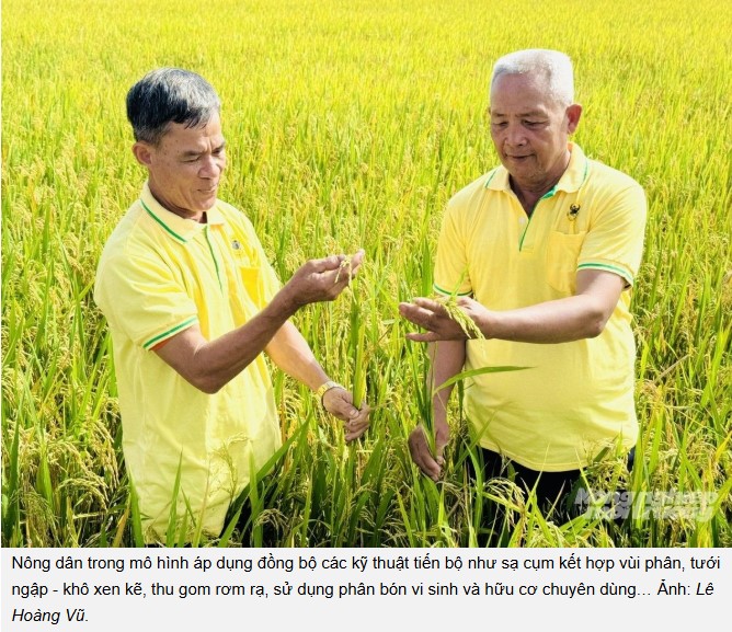 So với tập quán truyền thống, mô hình giúp tiết kiệm 41,6% lượng giống, giảm đáng kể chi phí phân bón, thuốc BVTV (giảm 2 lần phun/vụ), tiết kiệm khoảng 30–40% lượng nước tưới. Tổng chi phí sản xuất lúa trong mô hình giảm 1,42 triệu đồng/ha, trong khi năng suất tăng 0,31 tấn/ha, nâng lợi nhuận bình quân thêm gần 3,9 triệu đồng/ha - cao hơn 20% so với ngoài mô hình. Giá thành sản xuất 1 kg lúa cũng giảm 396 đồng/kg, tạo lợi thế cạnh tranh cho sản phẩm trên thị trường.