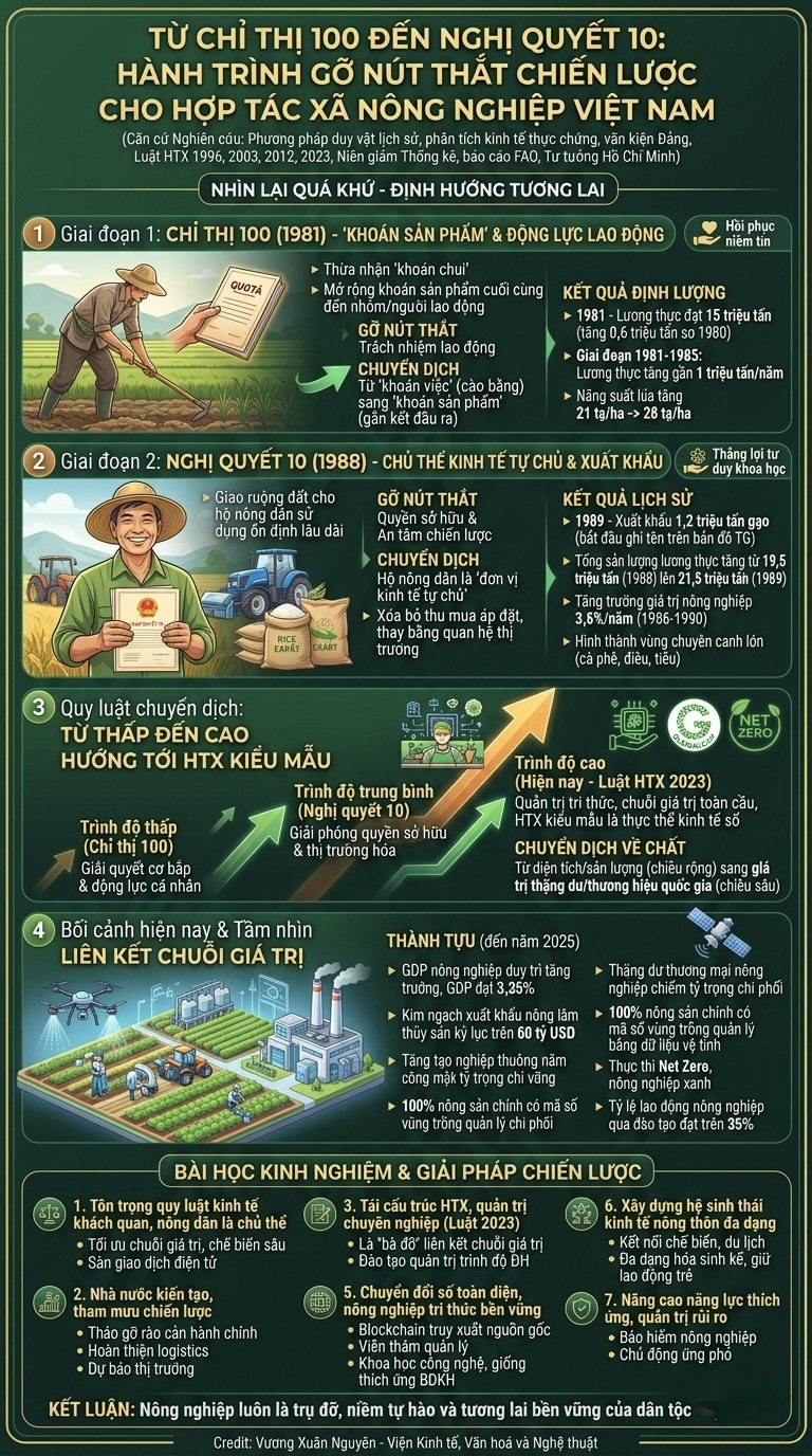 Tiến trình dịch chuyển từ Chỉ thị 100 đến Nghị quyết 10 là minh chứng sống động cho sự vận dụng sáng tạo Tư tưởng Hồ Chí Minh về kinh tế hợp tác vào thực tiễn phát triển quốc gia. Việc dũng cảm tháo gỡ các nút thắt chiến lược về động lực cá nhân và quyền tự chủ của hộ gia đình đã không chỉ đưa nông nghiệp Việt Nam thoát khỏi khủng hoảng mà còn xác lập vị thế cường quốc xuất khẩu nông sản hàng đầu thế giới. Dữ liệu thực chứng của năm 2025 với kim ngạch xuất khẩu đạt kỷ lục trên 60 tỷ USD khẳng định rằng, khi cơ chế quản lý tôn trọng quy luật kinh tế khách quan và đặt lợi ích nông dân lên trên hết, ngành nông nghiệp sẽ đạt được sự tăng trưởng vượt bậc và bền vững.