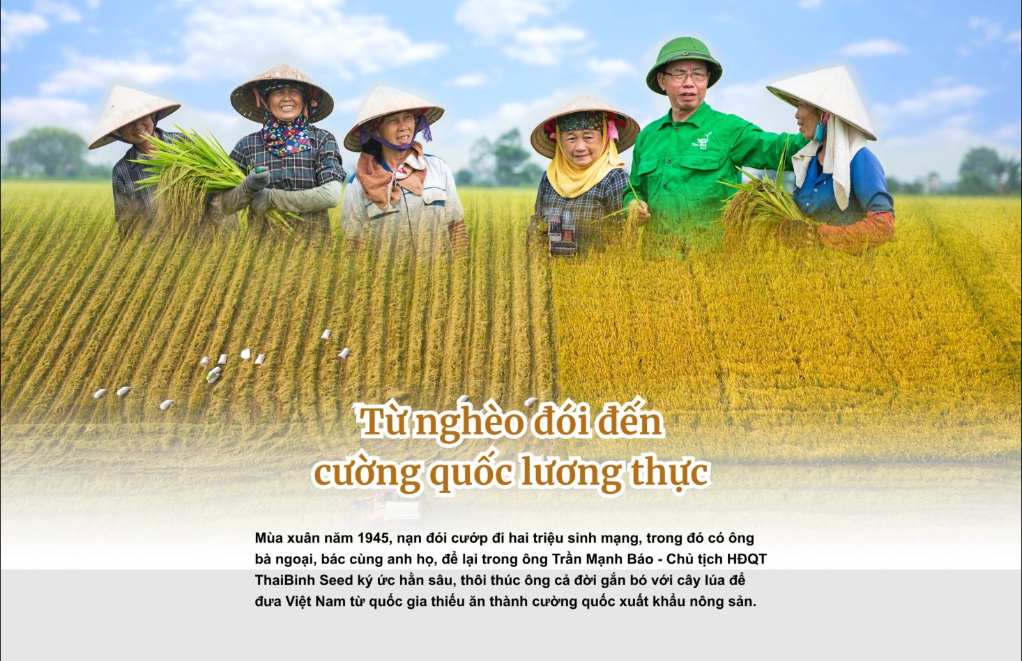 Với Chủ tịch ThaiBinh Seed Trần Mạnh Báo, người gắn bó nửa thế kỷ với hạt lúa, câu chuyện lại trở nên đời thường. Ông nhớ lại năm 13 tuổi, nhìn theo bóng cha ra biển với đôi kheo đánh cá, ông tự nhủ phải làm điều gì đó để nông dân bớt nhọc nhằn. Hơn nửa thế kỷ sau, khi nông dân từ chỗ cày sau con trâu nay đã điều khiển drone trong canh tác, ông nói: "Không chỉ hạt gạo mà cả cà phê, hồ tiêu, trái cây, thủy sản cũng sẽ trở thành niềm kiêu hãnh của Việt Nam trên bàn cờ toàn cầu".