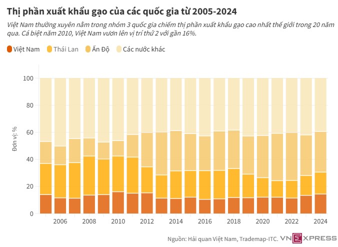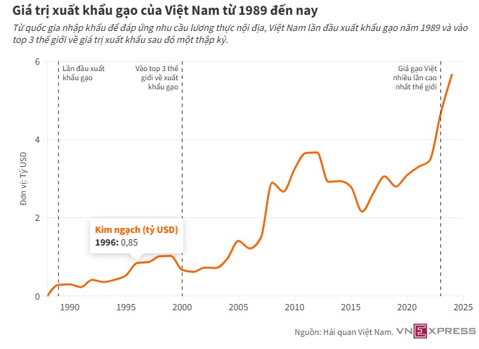 Năm 2023, gạo Việt lần đầu dẫn đầu thế giới về giá, vượt các đối thủ như Thái Lan, Ấn Độ. Xuất khẩu gạo đạt kỷ lục 9 triệu tấn vào năm ngoái, đem về 5,7 tỷ USD, mức cao nhất lịch sử.