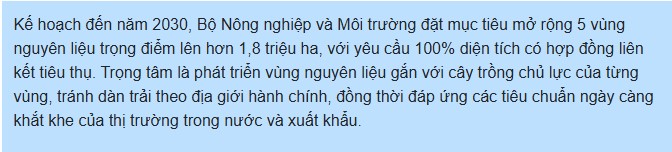 Về định hướng dài hạn, Bộ Nông nghiệp và Môi trường sẽ xây dựng đề án vùng nguyên liệu ở quy mô toàn quốc. Những tỉnh đã có danh sách cây chủ lực sẽ tiếp tục mở rộng và hình thành vùng nguyên liệu tập trung. Trên nền tảng quy hoạch cây trồng chủ lực cấp quốc gia, việc cụ thể hóa xuống cấp tỉnh sẽ giúp giám sát chặt hơn, đồng thời tạo cam kết dài hạn với doanh nghiệp về tính ổn định của vùng nguyên liệu.